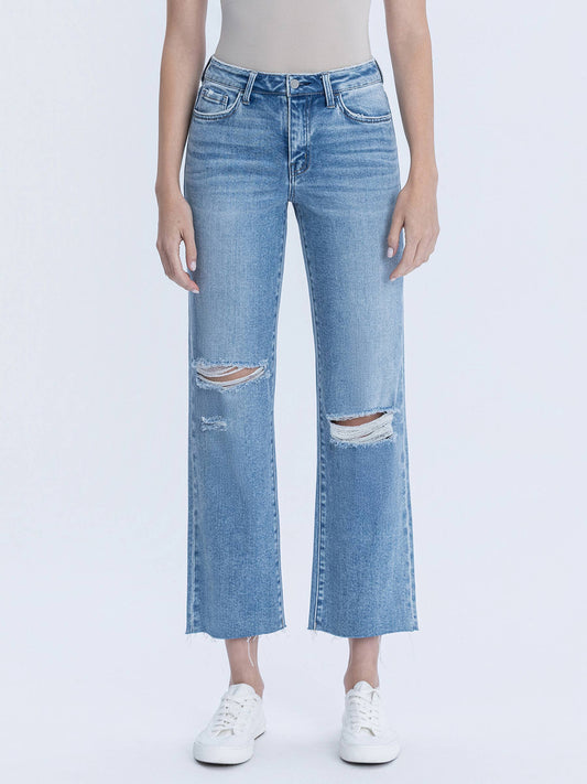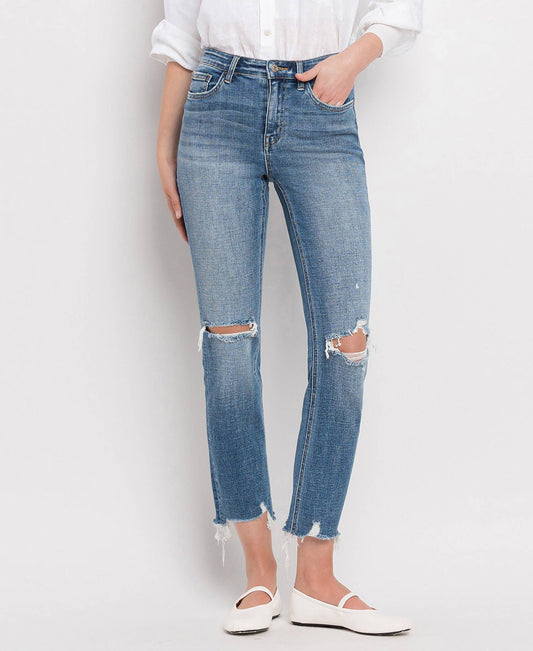 High Rise Distressed Slim Straight Jeans
