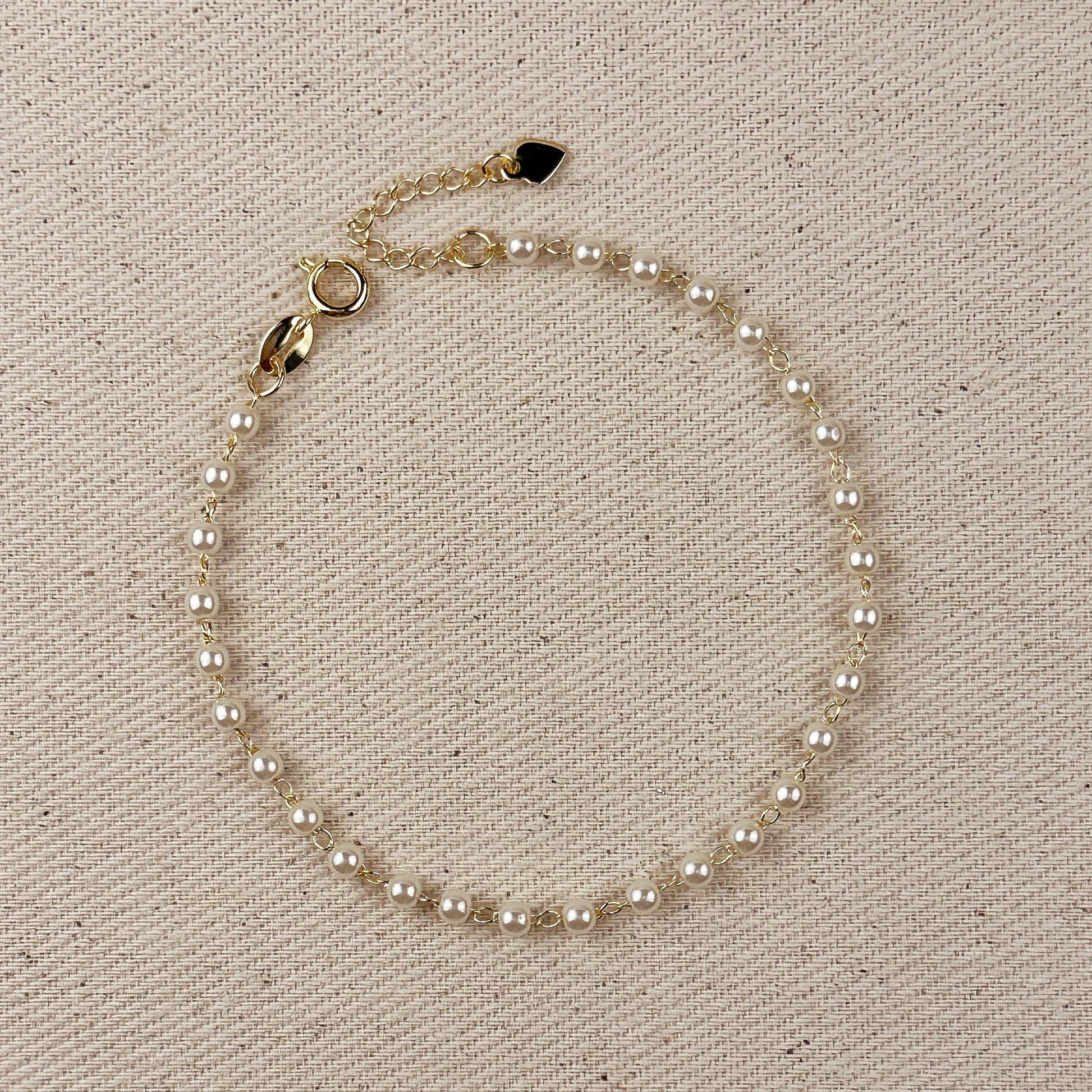 Indulge in timeless elegance with our 18k Gold Filled 3mm Pearl Bracelet — a refined blend of classic beauty and modern craftsmanship. Featuring delicate 3mm simulated pearl beads on a radiant 18k gold filled chain, this bracelet exudes sophistication and grace with every wear.