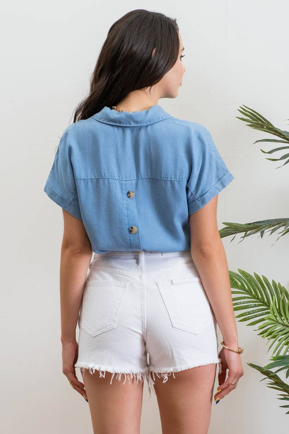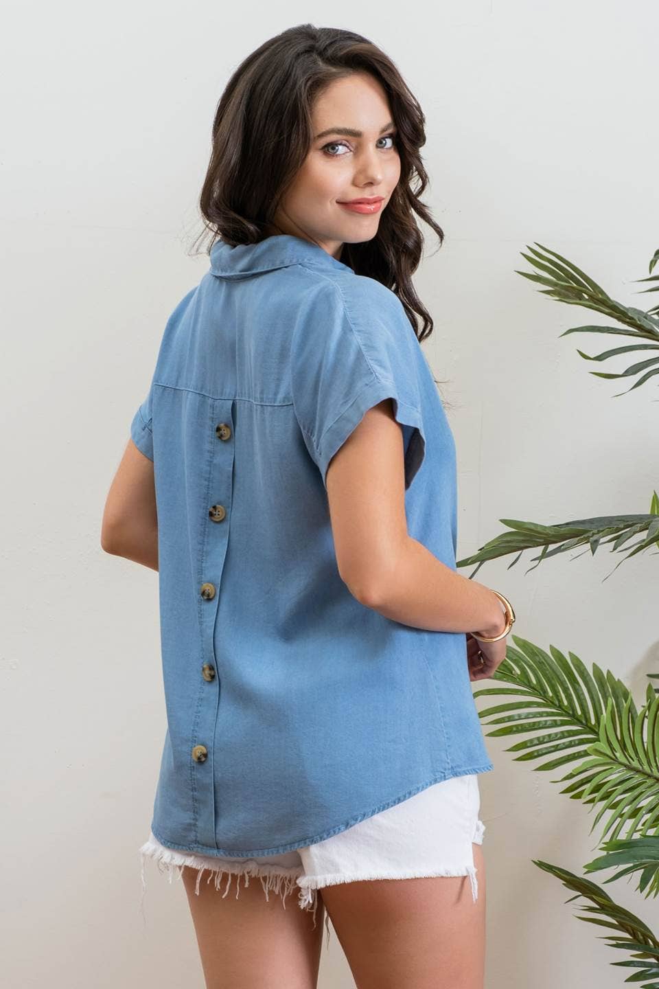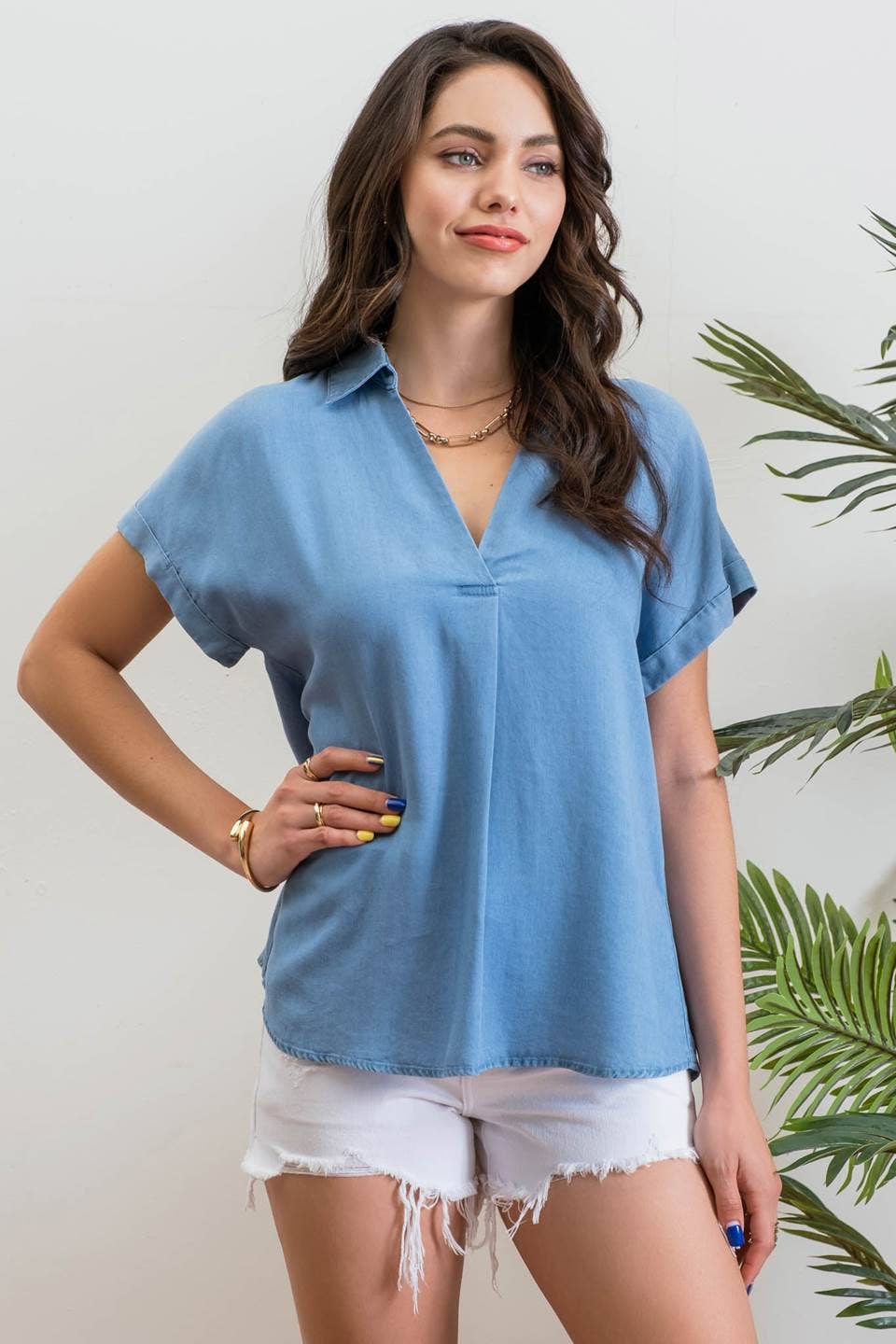 VNECK COLLAR BACK BUTTON DOWN DETAIL SOLID PRINT FOLDED SLEEVES