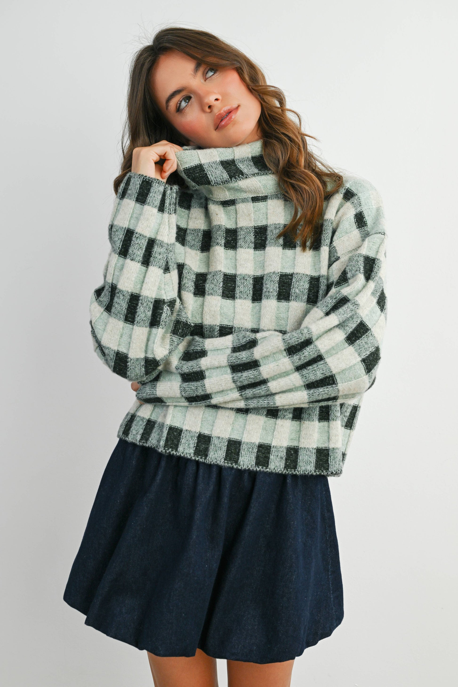 The classic check pattern adds a touch of sophistication, while the turtleneck design keeps you extra snug on chilly days. Whether you’re dressing it up for a special occasion or styling it casually with jeans and boots, this versatile piece brings effortless polish to any look.