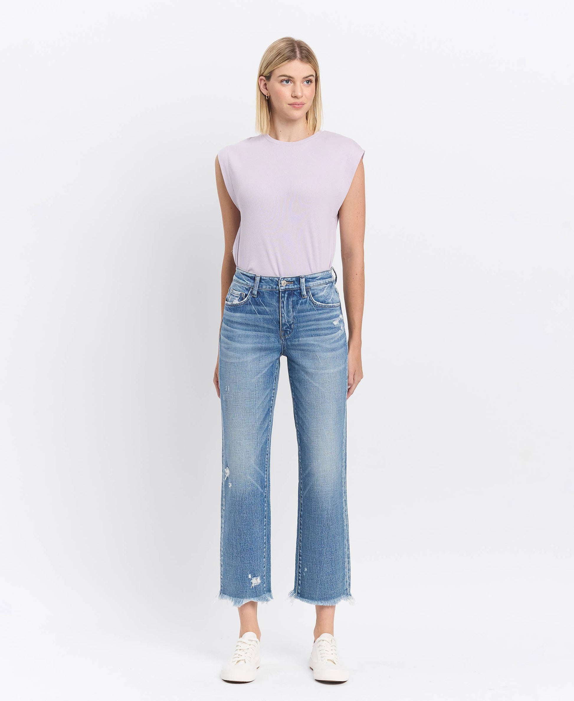 Add a touch of effortless edge to your everyday look with these High Rise Frayed Hem Straight Jeans. Crafted from comfort stretch denim, they feature a flattering high-rise waist, distressed detailing, and a cropped straight-leg silhouette. The frayed hem adds the perfect laid-back finish, making them easy to style with sneakers, boots, or heels for any occasion.