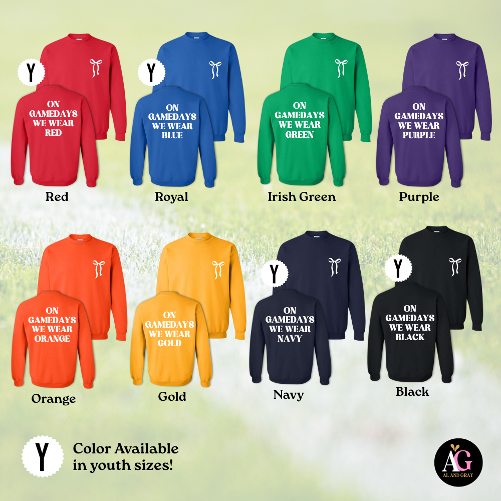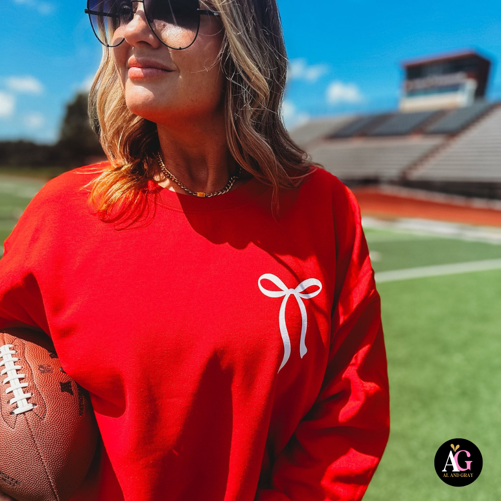 Show your team spirit in cozy style! This classic crewneck sweatshirt features the bold phrase “On Gamedays we wear red” across the front, accented with a charming bow detail for a fun, feminine touch. Perfect for cheering on your team while staying warm and comfortable.