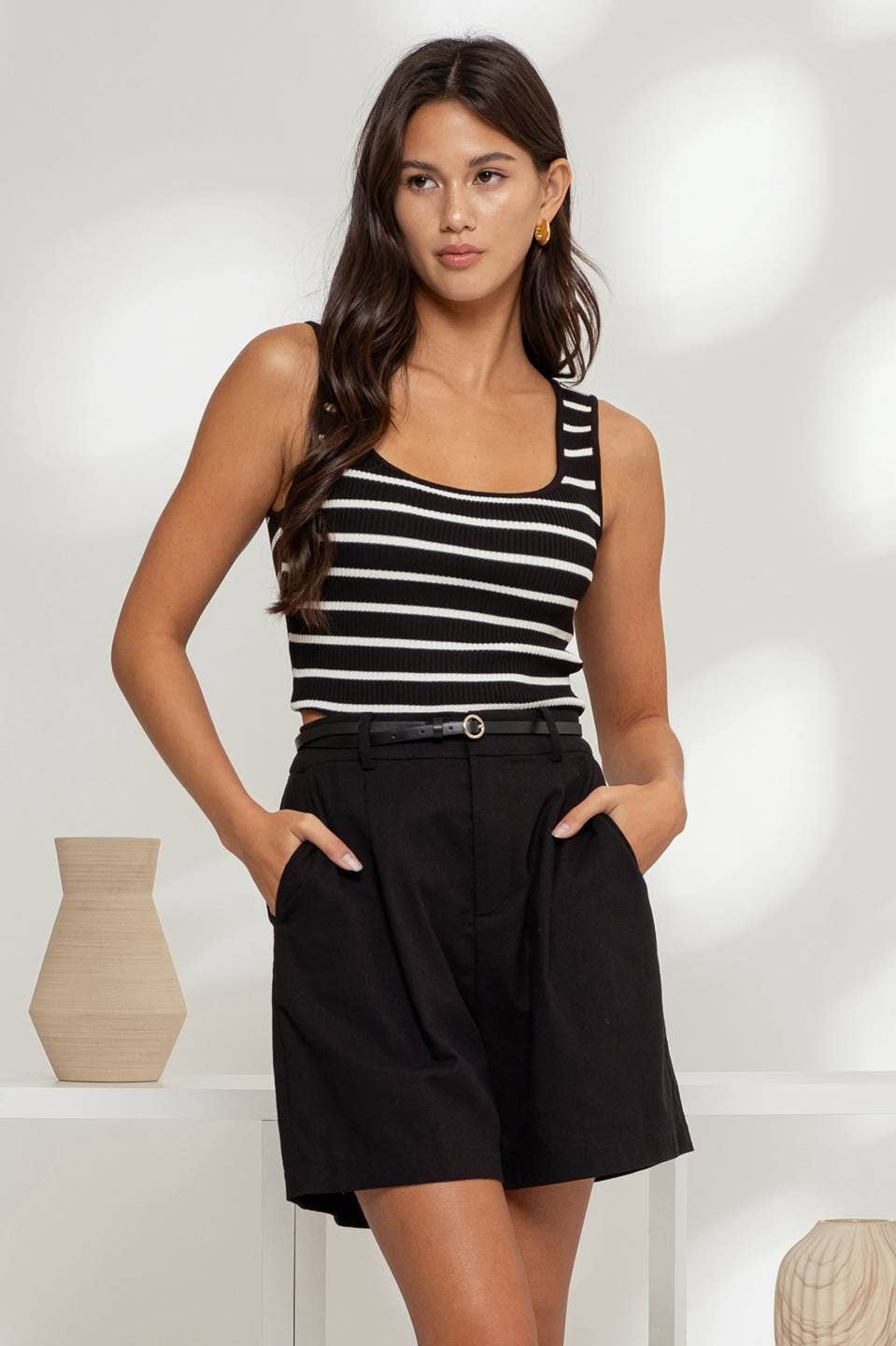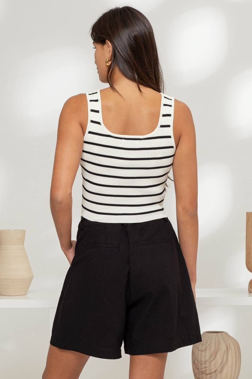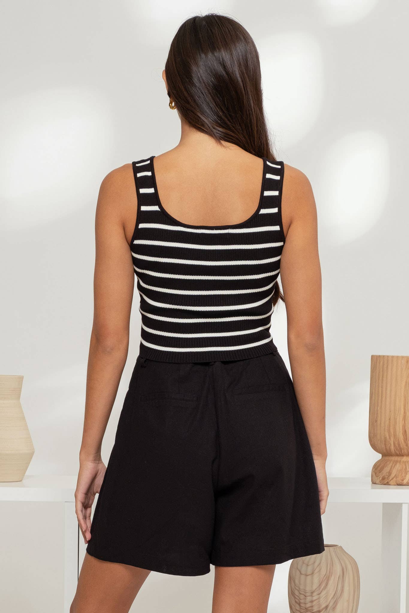 Effortlessly chic and versatile, this sweater knit tank top features a large scoop neckline and a flattering sleeveless cut. The timeless stripe pattern adds a touch of modern charm, while the lightweight knit makes it perfect for layering or wearing solo. Crafted from a soft blend of 70% Viscose and 30% Polyester, it offers both comfort and style with a breathable, easy-to-wear fit.