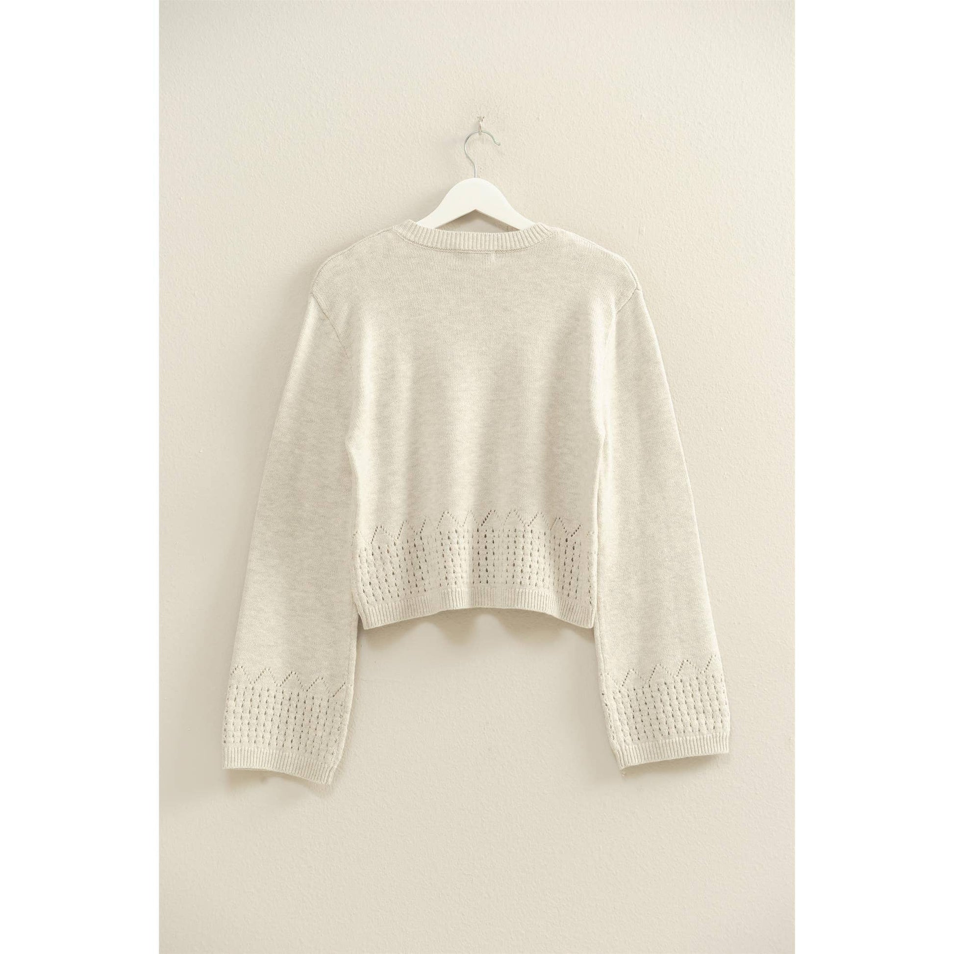 A timeless staple with a modern twist, this sweater features a classic fit accented by delicate eyelet details along the hem. Designed for effortless versatility, it transitions seamlessly from casual daytime wear to chic evening outings. Pair it with tailored trousers for a polished edge or layer over a collared shirt for a sophisticated, relaxed look. Perfect for cooler days and cozy nights alike.
